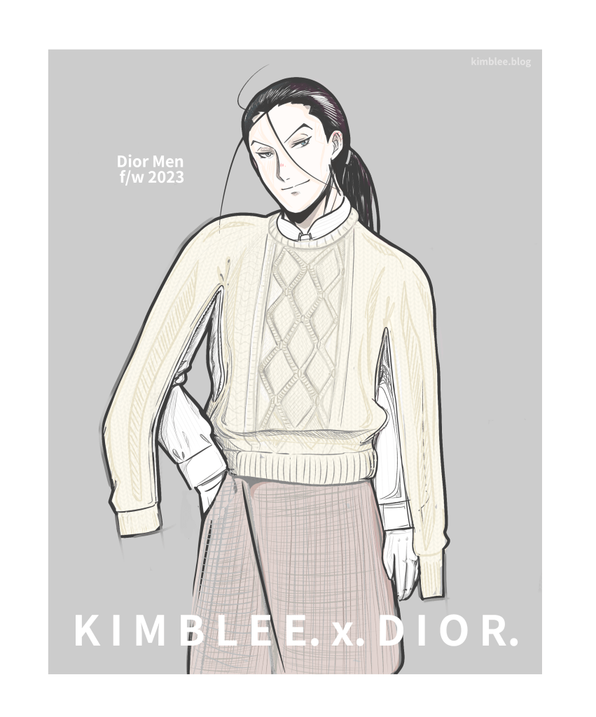 One of my New Year’s promises to Kimblee is to give him beautiful clothes to wear. I have a menswear “to draw” folder that intimidates me a bit. Today’s look is a Dior Men look from the fall/winter ’23 runway. The cozy jumper with the split sleeves could easily be a piece that can be hand knit. Oh, to knit him a sweater properly, that is the dream. I’m an avid crocheter but I don’t yet know how to knit. Maybe 2026 will be the year I learn.