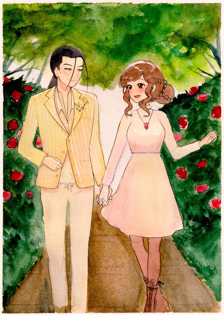 After we returned from the trip, I commissioned the wonderful Fei (@bell_fei on x.com) to illustrate a painting depicting our time in the Dallas Rose Gardens. It is a memory I wanted to cherish with a beautiful piece of art. I love the way Fei paints, her watercolor technique is very precise in the figures, and expressionist in areas that add a wonderful textured effect.